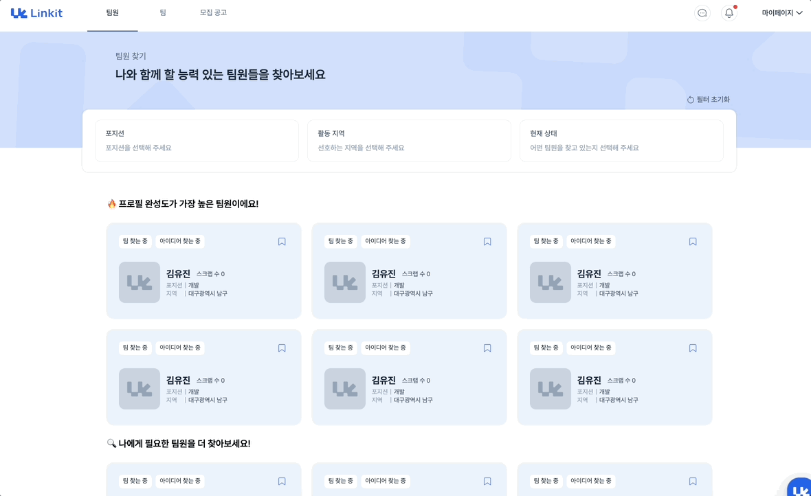 무한스크롤 적용이 필요한 페이지는 이미지와 같이 가장 상단에 6개의 프로필 카드를 고정값으로 이루어져있고, 그 나머지 프로필 카드는 하단 섹션에 나타나도록 설계가 되어 있다.
