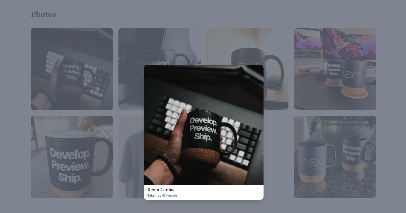 photos/[id]/page.tsx의 경로를 가로채어 모달로 표시합니다. /photos 페이지가 시작점이고, 여기서 모든 사진을 볼 수 있습니다. 각 사진을 볼 수 있는 동적 라우트를 포함하고 있고, 사용자가 모든 사진 페이지에서 특정 사진으로 이동할 때 라우트를 가로채는 방식으로 작동되어 집니다.